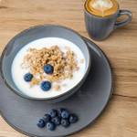 Kuchen, Kaffee, Salat, Sandwiches und Müsli.