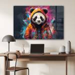 Ein Panda in einem orangefarbenen Mantel auf einem Graffiti-Hintergrund.
