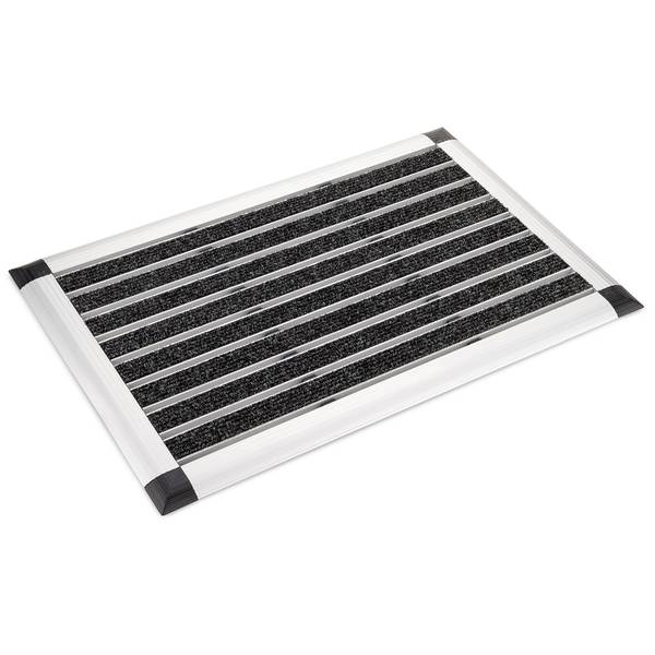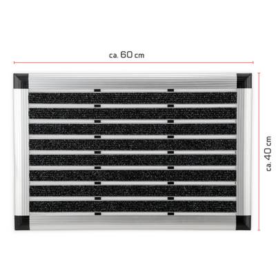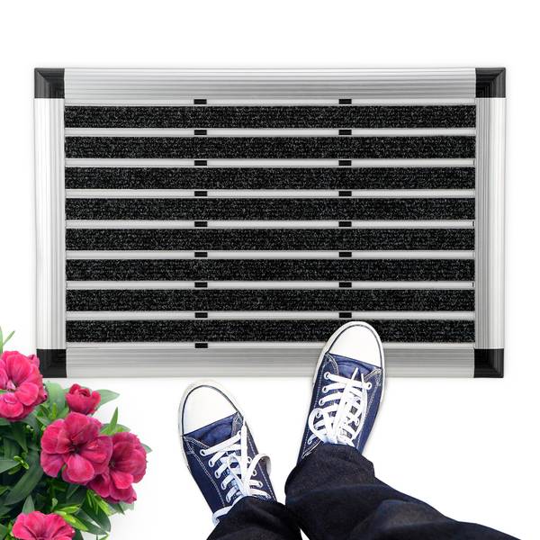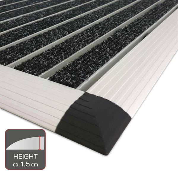 Die Alufußmatte hat ein Maß von 40x60 cm / 50x80 cm und eine Höhe von 1,5 cm. Die Fußmatte bietet sich ideal als Haustür Matte an, die Fußmatte ist wetterfest und hat Kapazität für die Schmutz- und Wasseraufnahme.