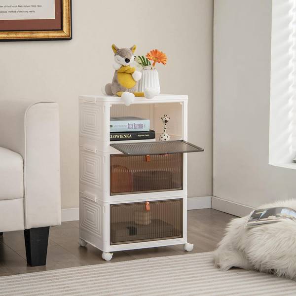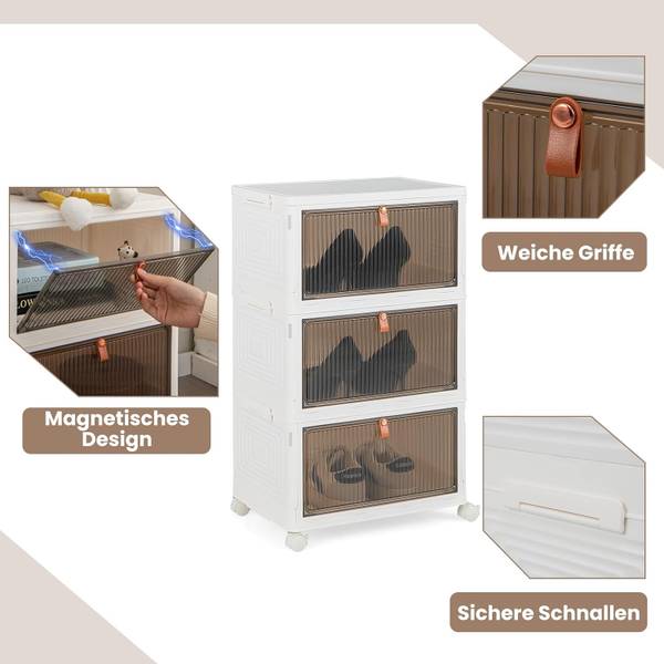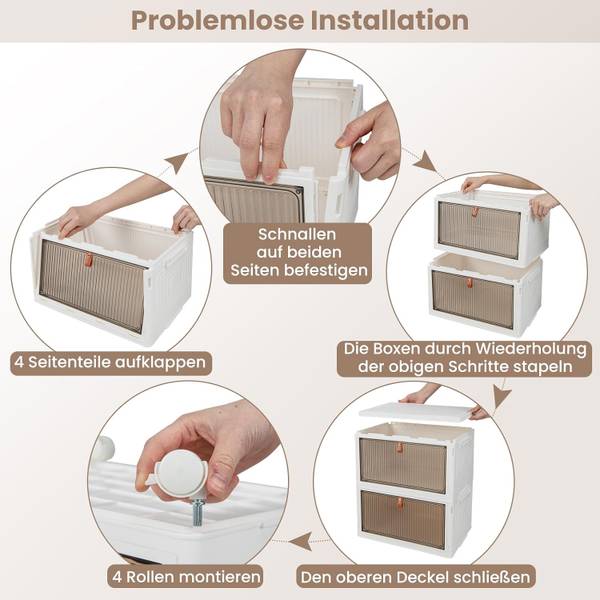 Die große Aufbewahrungsbox besteht aus hochfestem PP-Material mit exquisiter Verarbeitung und ist auf Langlebigkeit ausgelegt. Dank der transparenten Türen mit weichen Griffen können Sie die Gegenstände im Inneren leicht sehen und bequem herausnehmen. Mit Doppelmagneten, die sich gegenseitig anziehen, schließt jede Tür fest. Praktischerweise können Sie diesen stapelbaren Boxen dank der leichtgängigen Universalräder von Raum zu Raum bewegen. Und er lässt sich zur einfachen Aufbewahrung oder zum Transport zusammenklappen. Bei der Installation werden Sie aufgrund des stapelbaren Designs die Anzahl der Ebenen bestimmen und je zwei Ebenen mit den Schnallen auf jeder Seite befestigen.