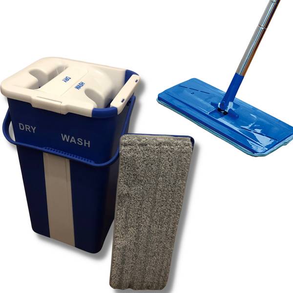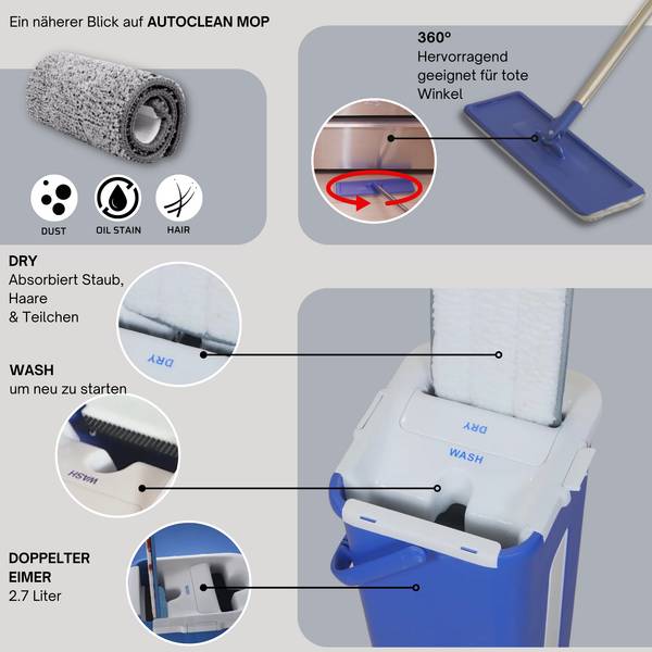 - Das Reinigungssystem mit automatisch trocknendem Mopp und Eimer. Mikrofaser Mop mit Doppelkammer Eimer - 2,7 Liter Fassungsvermögen des Eimers. Auswringfunktion