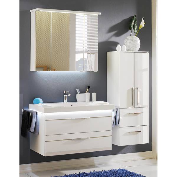 - Lieferumfang: Badezimmerset bestehend aus 1 Waschtisch inklusive Mineralgussbecken & LED-Fugenbeleuchtung, 1 Midischrank & 1 Spiegelschrank inklusive LED-Kranzbeleuchtung & LED-Waschplatzbeleuchtung