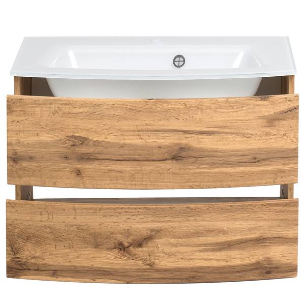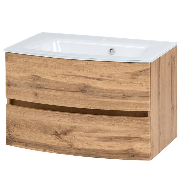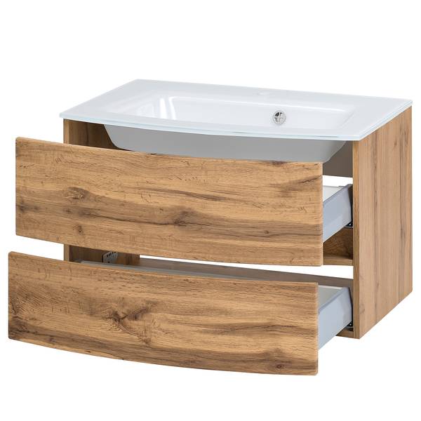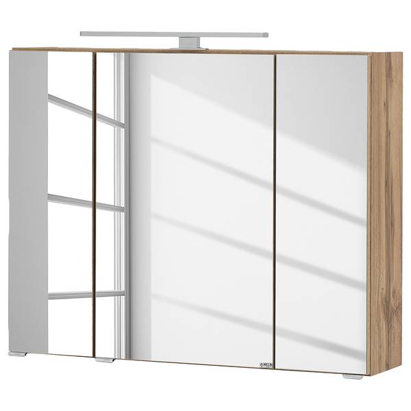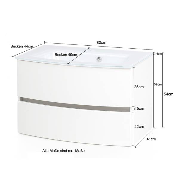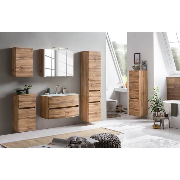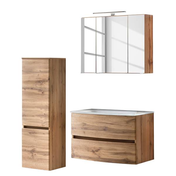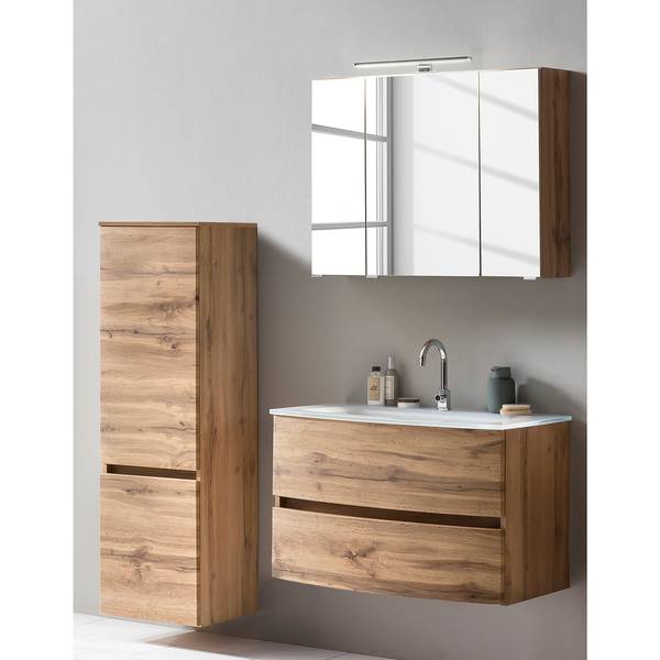 - Lieferumfang: Badezimmerset bestehend aus 1 Waschtisch inklusive Glasbecken, 1 Midischrank & 1 Spiegelschrank inklusive Beleuchtung