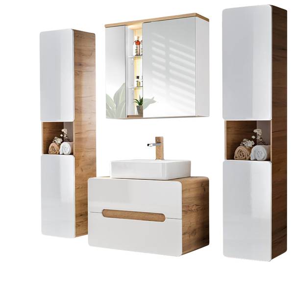 - Lieferumfang: 1 Spiegelschrank, 1 Waschbecken, 1 Waschbeckenschrank, 2 Hochschränke
