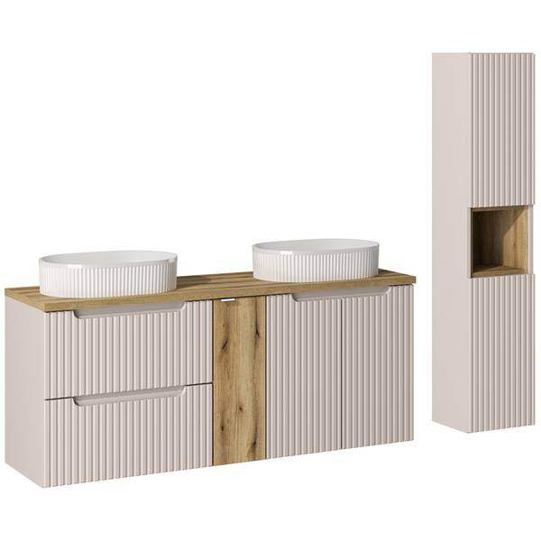 - Lieferumfang: 1 Badregal, 1 Hochschrank, 1 Unterschrank, 1 Waschbeckenschrank, 1 Waschtischplatte, 2 Waschbecken