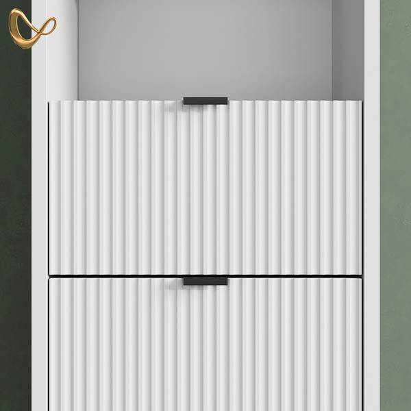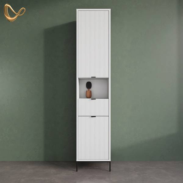LIEFERUMFANG: schmaler Badezimmerschrank (Dekoration nicht im Lieferumfang enthalten), Montageanleitung, Montagematerial.