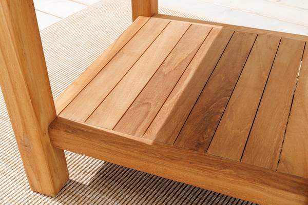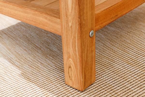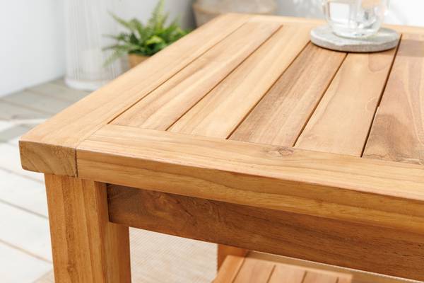 Der Beistelltisch aus Teakholz ist eine stilvolle Ergänzung für Deinen Garten, Balkon oder die Terrasse. Das Holz des Tisches ist mit feinem Sandpapier endgeschliffen, erhält danach eine chemische Oberflächenbehandlung zur Homogenisierung der Farbe und entwickelt mit der Zeit die für Teakholz typische silbergraue Patina. Diese lässt sich ganz einfach abschleifen und Dein Outdoor-Tisch erstrahlt in neuem Glanz! Auch Verschmutzungen durch die Witterung kannst Du ohne Probleme mit einer Bürste und etwas milder Seifenlauge entfernen. Verfärbungen stellen keinen Reklamationsgrund dar. Teakholz ist die perfekte Wahl, wenn Du auf der Such nach einem langlebigen Möbelstück bist. Es erfordert sehr wenig Wartung und Pflege.