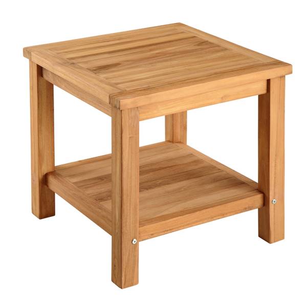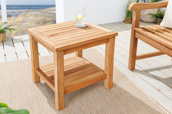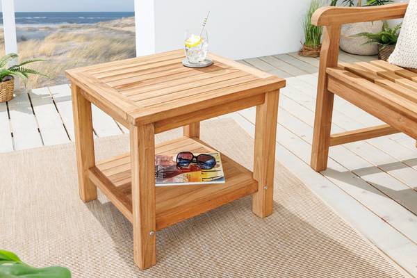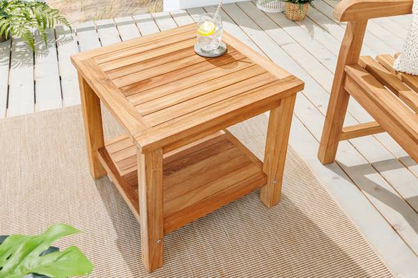 Wenn es draußen wieder wärmer wird, gibt es doch fast nichts Schöneres, als im Freien zu frühstücken oder abends gemeinsam mit Freunden den Tag ausklingen zu lassen. Unser Beistelltisch aus massivem Teakholz ist da eine praktische Ergänzung Deiner Outdoor-Möbel. Auf dem kleinen Tisch lassen sich hervorragend Getränke, Snacks oder Dekoration wie Blumen oder eine Laterne abstellen.