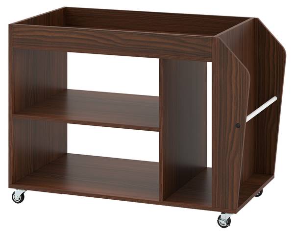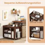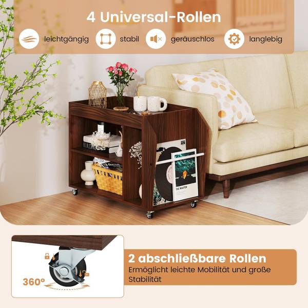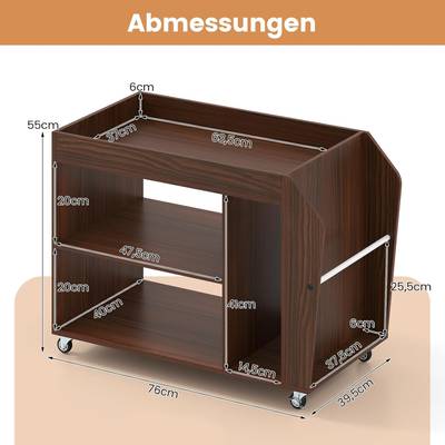 Mit einer geräumigen Arbeitsplatte, 3 Fächern und einem praktischen seitlichen Ablageregal ist dieser gut verarbeitete rollbare Beistelltisch eine vielseitige Aufbewahrungslösung. Er ist aus stabilen Holzplatten gefertigt und kann bis zu 55,5 kg tragen, ohne an Stabilität zu verlieren. Dieser mobile Wagen ist mit 4 360°-Schwenkrädern ausgestattet, von denen 2 festgestellt werden können, sodass Sie ihn leicht in Ihrem Raum bewegen können. Als multifunktionale Ergänzung für Ihren Raum kann er als Nachttisch, Bücherregal oder Künstlerbedarfswagen verwendet werden. Er verfügt zu guter Letzt über ein oberes Geländer, um das Herunterfallen von Gegenständen zu verhindern, und Schraubenlochabdeckungen für ein einheitliches Erscheinungsbild.