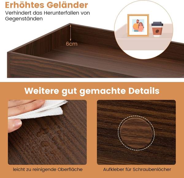 Mit einem 6 cm hohen Schutzgeländer an der Oberseite, das das Herunterfallen von Gegenständen verhindert, und Schraubenlochabdeckungen für ein perfektes Finish bietet der 76 cm L x 39,5 cm B x 55 cm H große Nachttisch durchdachte Details, die seine Funktionalität verbessern.