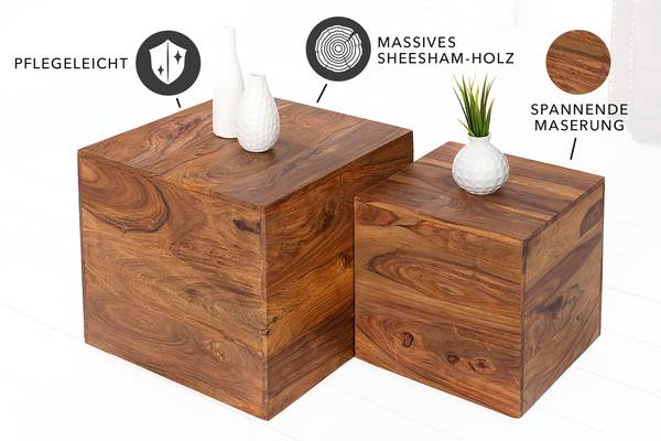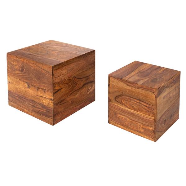 Rustikal, exklusiv und mit viel Klasse präsentieren sich diese schönen Beistelltische im Set. Die wundervolle Maserung und die natürlichen Gebrauchsspuren versprühen rustikales und mediterranes Flair in Deinem Ambiente. Die MAKASSAR Beistelltische bilden durch ihre puristische Form eine Symbiose zwischen einem praktischen Möbelstück und einer Skulptur. Die 2 Würfel lassen sich beliebig stellen, ob nebeneinander oder an verschiedenen Positionen - Deiner Fantasie sind keine Grenzen gesetzt. Bei Bedarf lässt sich der kleinere Würfel in den größeren verstauen.