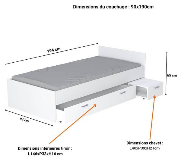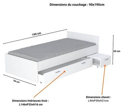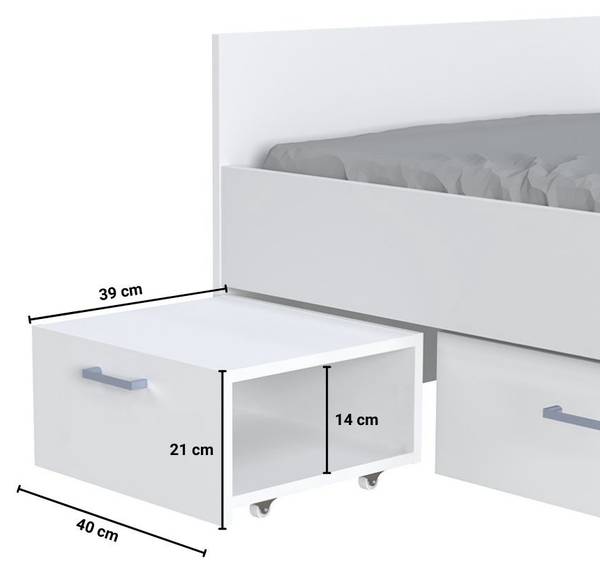 - Lieferumfang: 1x Bett 90x190+ Nachttisch+ 1x Schublade