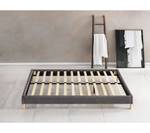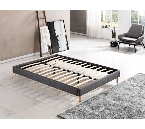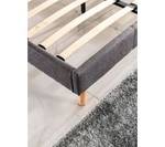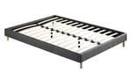 Die Die Struktur des Holzbettes ist mit einem grauen Stoff bezogen.