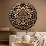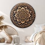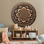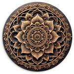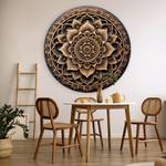 Ein Mandala aus Holz auf einem hölzernen Hintergrund.