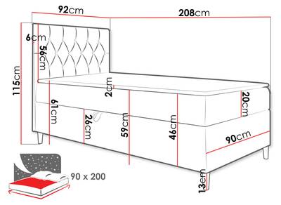 - Bettkasten: Breite: 77 cm, Höhe: 25 cm, Länge: 197 cm.