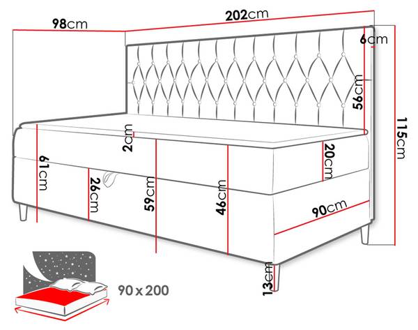 - Bettkasten: Breite: 87 cm, Höhe: 25 cm, Länge: 197 cm.