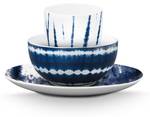 Die Teile des Set/3 Breakfast Set Tie-Dye verfügen über einen tiefblauen Batikdruck auf einem frischen weißen Hintergrund, mit verschiedenen Techniken und Mustern für eine verspielte Variation. Kombinieren Sie es mühelos mit dem weißen Basic-Geschirr von vtwonen für einen lustigen und stilvollen Look.