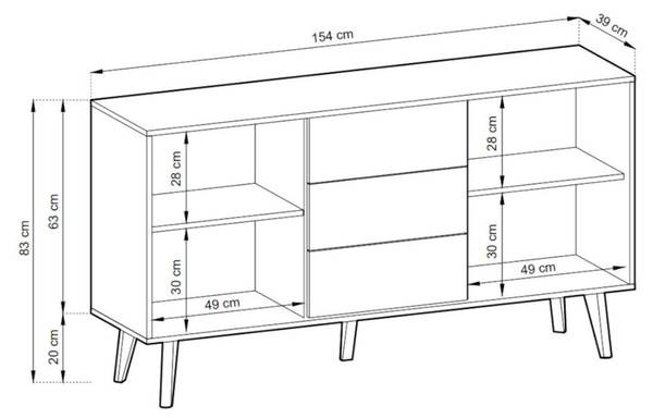 Ausgestattet mit geräumigen 3 Schubladen und 2 geräumigen Schrank mit einem Fachboden.Die stabilen Holzbeine, dank derer das Möbelstück höher steht, verleihen ihm ein loftartiges Design, das das Staubsaugen wesentlich erleichtert.