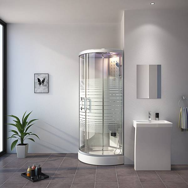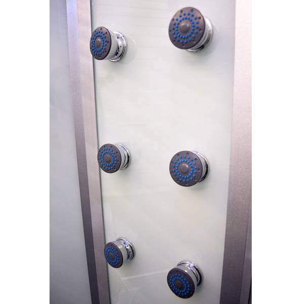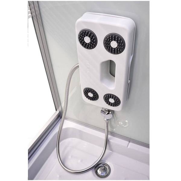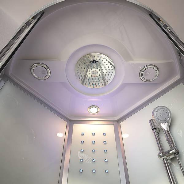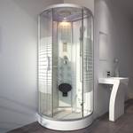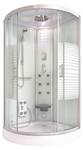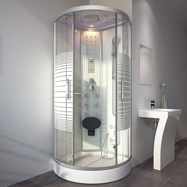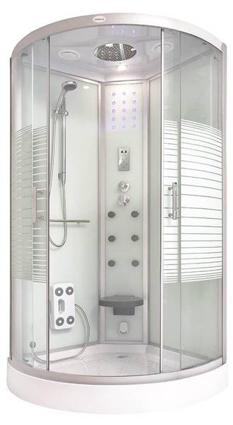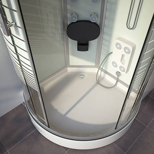 Diese Design-Dampf-Duschkabine ist ein wahres Multifunktions- und Raumsparwunder. Verliere zum Beispiel nach einem mühsamen Arbeitstag deinen Stress bei einem angenehmen Dampfsaunagang (bis 40 °C einstellbar), bei dem du garantiert ins Schwitzen kommst. Optional besteht für dich die Möglichkeit, ein Duftaroma von himmlischer Intensität (z. B. Eukalyptus, Minze u.v.a.) zu integrieren. Unsere "PEARL-Serie" verfügt außerdem über die Regenbrausenoption, bei der Wasser wie ein lauwarmer Tropenregen aus den unglaublichen 126 Düsen im Deckenhimmel rieselt. Eine entspannte Rückenmassage (6 Hydrojets) mit gleichzeitigem Lauschen deines Lieblingsradiosenders ist bei vielen Kunden beliebt. Selbstverständlich ist auch der gewöhnliche Gebrauch über eine Handbrause, die über die befestigte Duschstange justierbar ist, möglich. Die 15 blauen LED-Lichter im Mittelpaneel machen den "Wohlfühlfaktor" vollkommen. Über das integrierte Computerdisplay kannst du die Lautstärke und Senderwahl stufenlos regeln. Der im Mittelpaneel aufklappbare Sitz (max. Belastung ca. 100 kg) und die Antirutschstruktur im Wannenboden gewährleisten deinen sicheren Gebrauch dieser Duschkabine. Die 5 mm ESG-Vollverglasung aller Komponenten steht für unseren durchweg hohen Qualitätsstandard. Die hochmoderne Teilsatinierung schafft sowohl Diskretion als auch Lichtdurchlässigkeit. Die auf fast jeden Untergrund anzupassenden höhenverstellbaren Füße der Duschwanne sind ein weiteres herausragendes Feature, das diese Dusche von anderen hervorhebt. Alles in allem ist die WHITE PEARL eine sehr gute Dampf-Duschkabine mit einem herausragenden Preis-/Leistungsverhältnis!