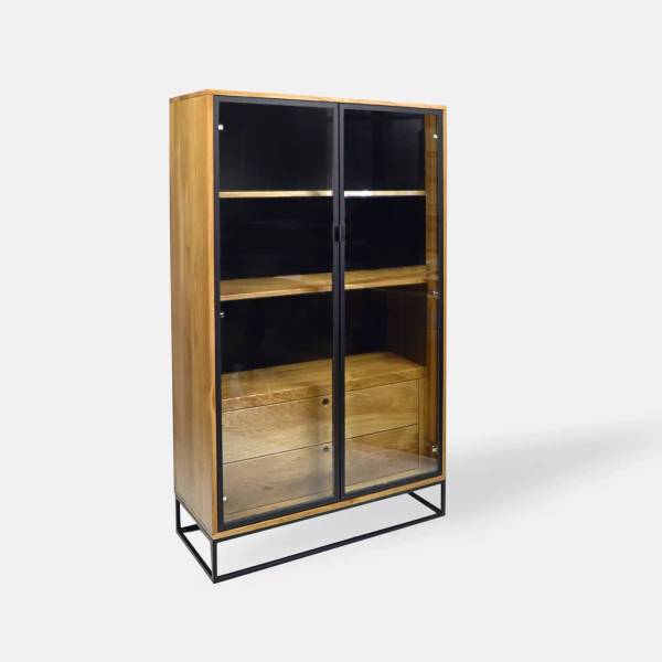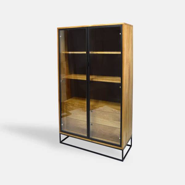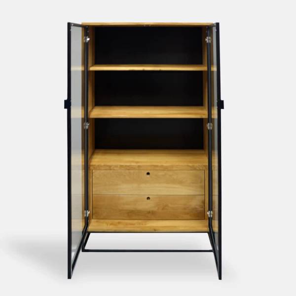 Handgefertigte Vitrine aus Eichenholz. Für den Holzschutz verwenden wir Lack und Öl von höchster Qualität. Schwarzer Stahl ist pulverbeschichtet. Bei Modellen mit Glastüren verwenden wir gehärtetes Glas.