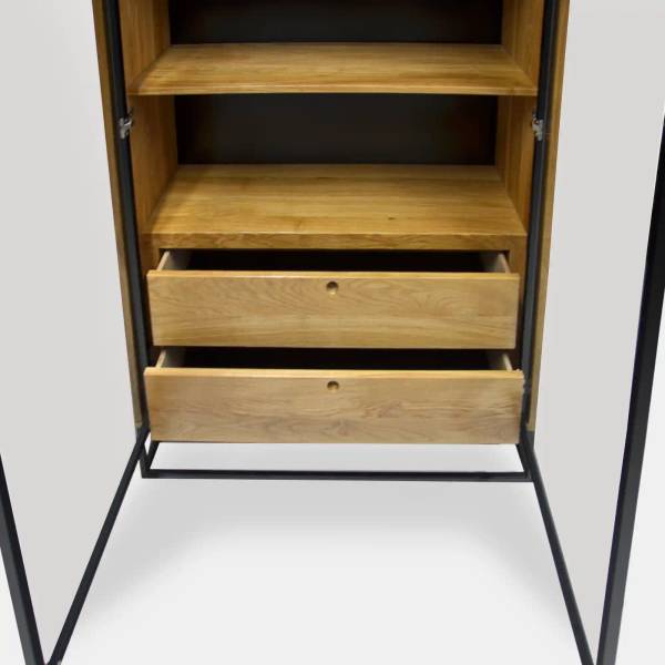Die industrielle Loft-Vitrine aus Eichenholz MERIS ist langlebig und hat einen einzigartigen Charme. Die Holzvitrine ist aus massivem Eichenholz mit einer natürlichen, warmen Farbgebung gefertigt. Die Struktur des Holzes ist sichtbar und jedes Möbelstück ist ein Unikat. Die freistehende Vitrine Loft mit Schubladen hat Metallelemente aus schwarz pulverbeschichtetem Stahl. Die Metallelemente kontrastieren mit dem natürlichen Material und unterstreichen den industriellen Stil des Möbels. Die traditionellen Schubladengriffe sind durch eine originelle Lösung mit Löchern in den Fronten ersetzt worden. Die Eichenvitrine mit Metallfüßen hat eine verglaste Tür mit Metallrahmen, hinter der sich zwei Einlegeböden und zwei Schubladen befinden. Die Bodenvitrine bietet viel Stauraum für Souvenirs, Dekorationen oder Bücher. Die industrielle Loft-Vitrine aus Eiche MERIS passt perfekt in jedes Esszimmer, Wohnzimmer oder Büro und sieht stilvoll, trendy und elegant aus.