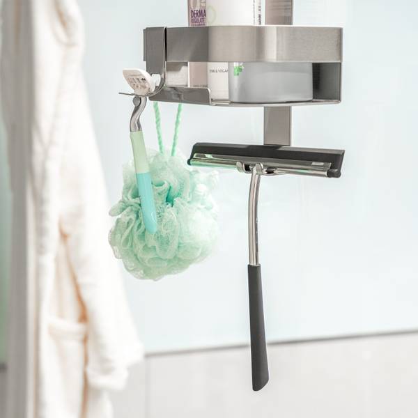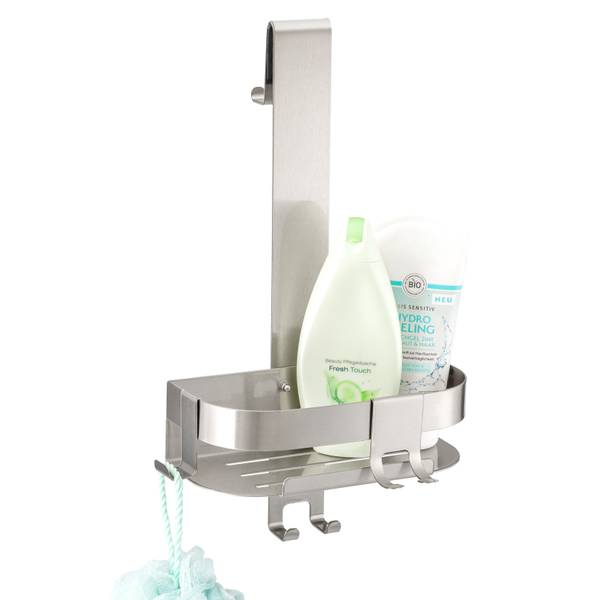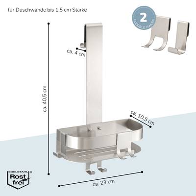 * einfache Aufhängung * griffbereite, standsichere Pflegeprodukte * keine Staunässe * Abstellfläche und Aufhängung am Korb * flexible Positionierung * 2 Haken innen, 2 Haken nach außen * 2 versetzbare Haken * Material: hochwertiger Edelstahl, transparenter Schutzlack * Abmessungen: ca. 23 x 40,5 x 10,5 cm (B/H/T)
