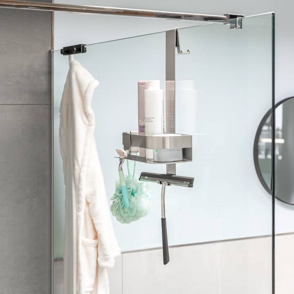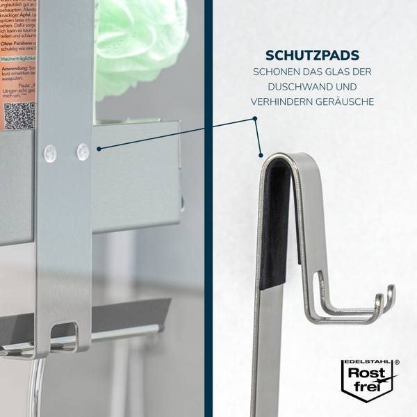 Dank der einfachen Aufhängung können Sie das Regal aus Edelstahl ohne lästiges Bohren direkt an die Glaswand oder die Tür Ihrer Duschkabine flexibel anbringen. Geeignet für Duschwände bis eine Stärke von 1,5 cm. Sie gewinnen nicht nur Platz, sondern sparen auch Zeit und Nerven bei der Installation.