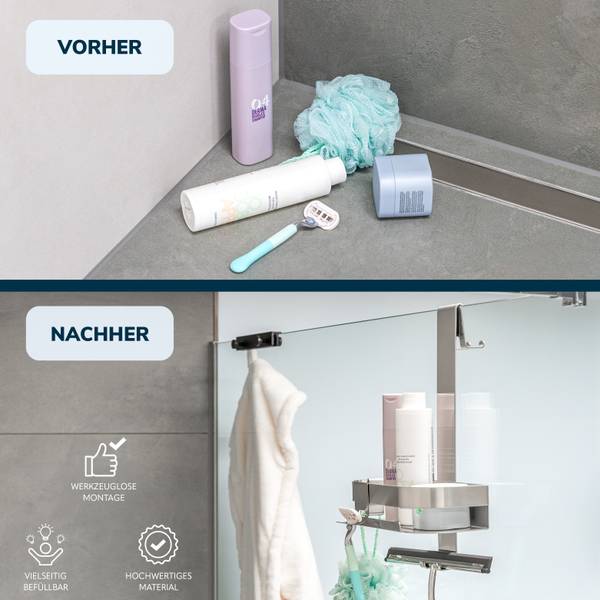 Mit dieser praktischen Duschablage wird die tägliche Dusche zu einem komfortablen Erlebnis. Jetzt ist Schluss mit dem gefährlichen Bücken und der Suche nach dem Shampoo in der rutschigen Dusche! Dieses Duschregal wird einfach über die Glaswand der Duschkabine gehängt, genau dort wo Sie es benötigen.