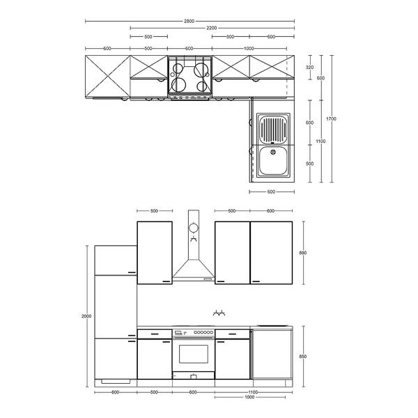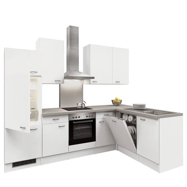 - Lieferumfang: Eckküche bestehend aus 1 Spülenschrank, 1 Herdschrank, 1 Geschirrspülschrank, 1 Unterschrank, 1 Eckschrank, 1 Kühlumbauschrank , 3 Hängeschränke & 2 Arbeitsplatten