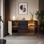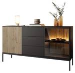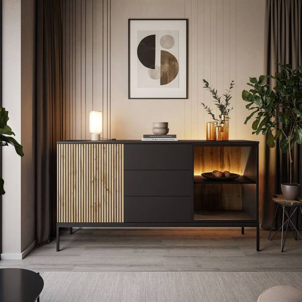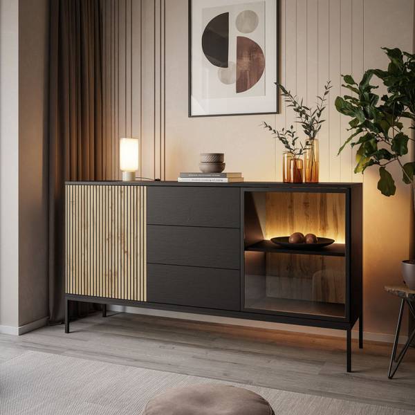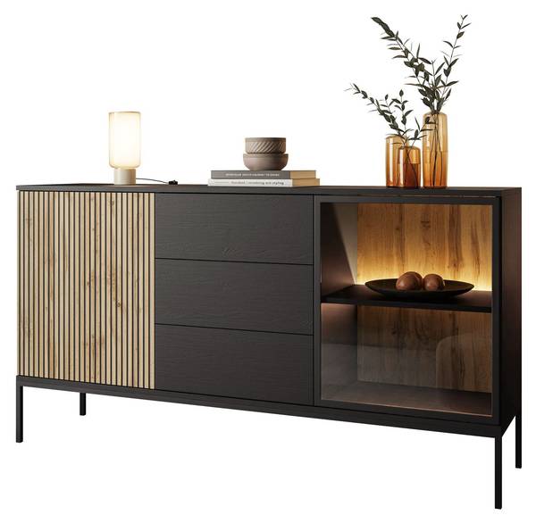 Der Innenraum ist in zwei geräumige Fächer mit Einlegeböden unterteilt, die die Rolle der praktischen Aufbewahrung und Präsentation Ihrer Gegenstände perfekt erfüllen werden. Eine der Fronten im Farbton Eiche Wotan strahlt die natürliche Wärme des Holzes aus, während die andere aus gehärtetem Glas gefertigt wurde, was der Kollektion Leichtigkeit und einen modernen Charakter verleiht. Der Korpus der Möbel ist in einem tiefen Schwarzton gehalten, der einen hervorragenden Kontrast zu den Fronten bildet und der gesamten Komposition einen einzigartigen Charakter verleiht.