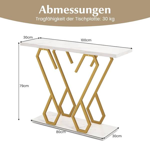Mit seiner Tischplatte aus Kunstmarmor, die einen Hauch von Eleganz verleiht, ist der Konsolentisch in dieser Beschreibung sowohl stilvoll als auch praktisch. Mit den Maßen 100 x 30 cm (L x B) bietet die Tischplatte ausreichend Platz zum Abstellen von Snacks, Zeitschriften oder Dekoartikeln. Die verstärkte Metallbasis sorgt für Stabilität und Robustheit mit einer bemerkenswerten Tragfähigkeit von bis zu 75 kg. Sein besprühter Rahmen ist wirksam gegen Rost und gewährleistet eine dauerhafte Nutzung. Eine vergrößerte Basis und Kippsicherungen sorgen für zusätzliche Stabilität und Sicherheit, sodass er für jede Familie geeignet ist. Mithilfe der mitgelieferten Anleitung lässt er sich leicht zusammenbauen und die glatte Oberfläche macht die Reinigung zum Kinderspiel. Zögern Sie nicht länger, bestellen sie noch heute!
