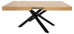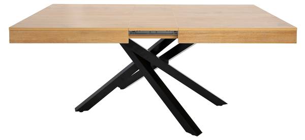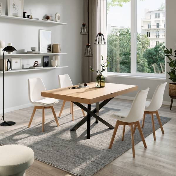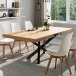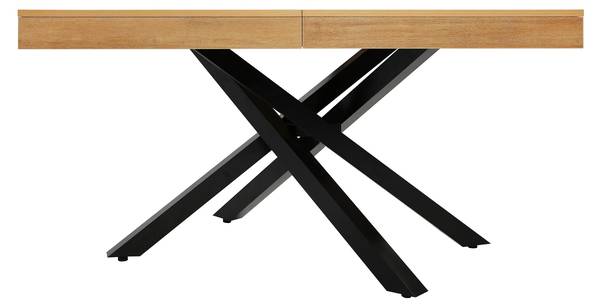 Die robuste Melamin-Tischplatte mit PVC-Kantenband ist widerstandsfähig gegen Kratzer und leicht zu reinigen. Das schwarze, gekreuzte Metallgestell sorgt für einen stabilen Stand und verleiht dem Tisch ein modernes Design.