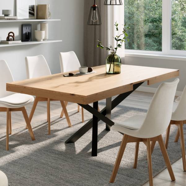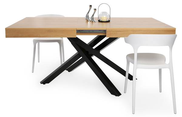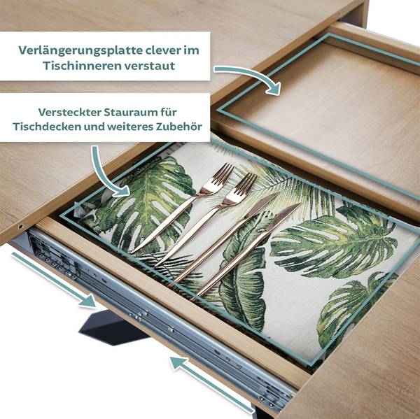 Zusätzlich zum praktischen Verlängerungssystem verfügt der Tisch über ein integriertes Fach unter der Tischplatte, in dem sich Besteck, Servietten oder Tischdekoration unterbringen lassen.
