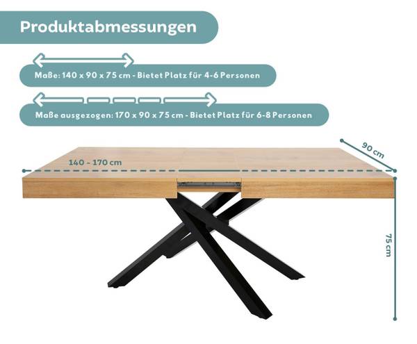 Dieser ausziehbare Esstisch kombiniert funktionales Design mit hochwertiger Verarbeitung und bietet eine flexible Lösung für unterschiedlich große Runden. Mit einer Grundlänge von 140 cm bietet er Platz für bis zu 6 Personen. Durch die 30 cm-Verlängerungsplatte, die clever im Inneren verstaut wird, kann der Tisch auf 170 cm erweitert werden – ideal für größere Familienessen oder gesellige Abende mit Freunden.