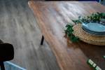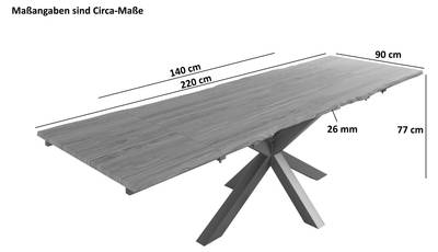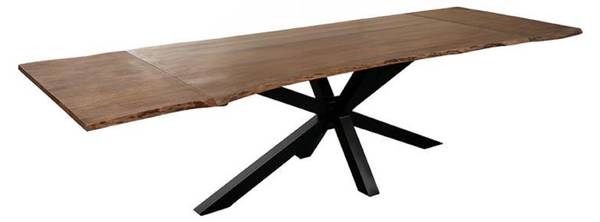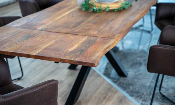 Natur Pur – Besonderes Highlight des Esszimmertisches sind die Tischkanten, die den natürlichen Formen eines Baumes entsprechen und direkt aus dem Baumstamm geschnitten wurden. Der Holztisch besitzt zwei Ansteckplatten mit denen dieser auf 220 x 90 cm erweitert werden kann.