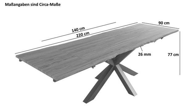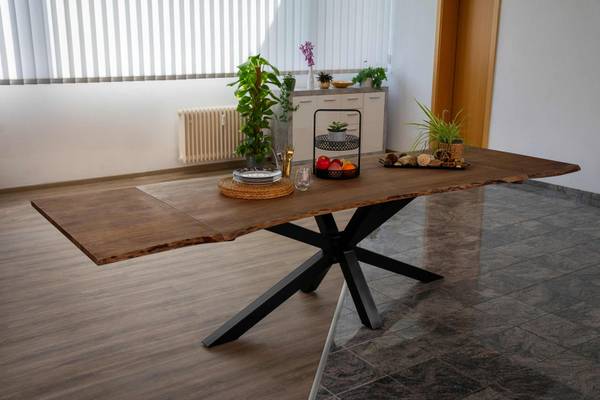 Hochwertiges Unikat – Der Esstisch besteht aus massiven und robusten Akazienholz. Aufgrund der einzigartigen Maserung erhalten Sie ein Unikat mit individuellem Charakter. Das Metallgestell sorgt für einen gelungenen Kontrast, welcher dem Massivholztisch einen Hauch von industriellem Look verleiht. Vorteil des Spidergestells: Mehr Beinfreiheit beim Sitzen am Tisch.