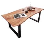 Dieser Baumkantentisch mit einzigartiger Holzmaserung eignet sich ideal als Esstisch. Die massive Tischplatte auf dem U-förmigen Metallgestell macht Ihren Essbereich zu einem echten Hingucker!