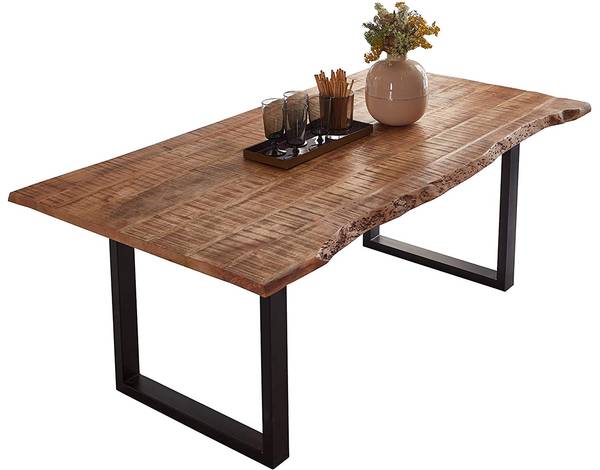 Der Esstisch besteht aus massiven und robusten Mangoholz. Aufgrund der einzigartigen Maserung und der immer unterschiedlichen Baumkante erhalten Sie ein Unikat mit individuellem Charakter. Das U-förmige Metallgestell verleiht dem Tisch einen industriellen Look. Das Highlight des Küchentischs bildet die raue und 2,6 cm dicke Tischplatte mit Säge-, Hobel- und Gebrauchsspuren. Dieser edle Tisch lässt sich daher problemlos mit verschiedenen Möbelstücken kombinieren.