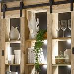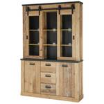 1 Buffetschrank mit 2 Schiebetüren mit Glaseinsatz und hochwertigen Scheunentorbeschlägen, 2 Drehtüren, Softclose Funktion, 3 Schubladen, je max. 3 kg, Softclose Funktion, 3 offenen Fächern, je max. 5 kg, 10 verstellbaren Böden, je max. 5 kg, 4`er LED Holzbodenbeleuchtung, Gesamtmaß B/H/T: ca. 133/201/38 cm