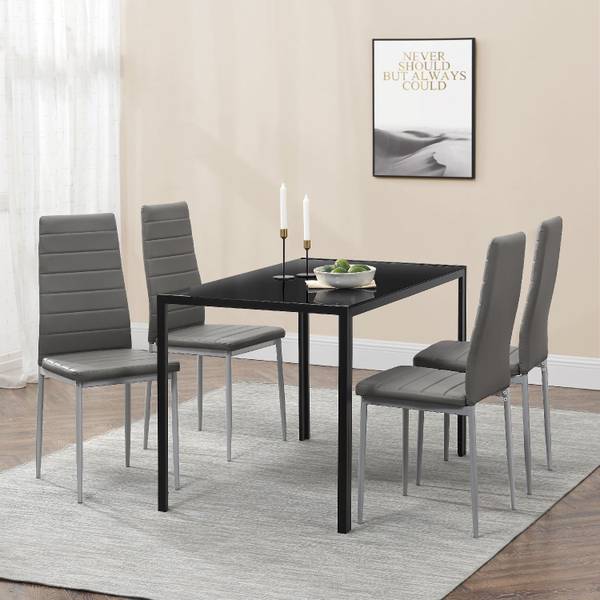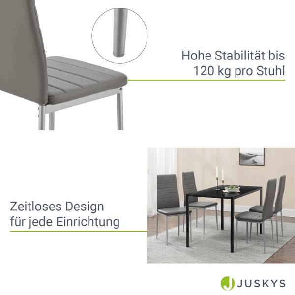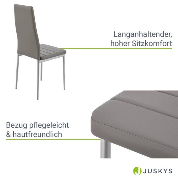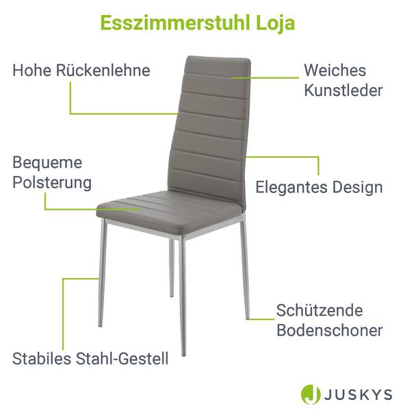 Mit den hochwertigen Esszimmerstühlen Loja im 4er Set (Grau) erleben Sie Sitzkomfort und modernes Design pur! Dieser stilvolle Stuhl begeistert mit seinem Kunstleder-Bezug nicht nur optisch, sondern überzeugt auch durch seine Bequemlichkeit. Zudem ist das Material pflegeleicht und auch auf Dauer robust. Ob beim gemütlichen Abendessen mit Freunden oder beim ausgedehnten Essen mit der Familie - der Küchenstuhl Loja ist der perfekte Begleiter für jede Gelegenheit.