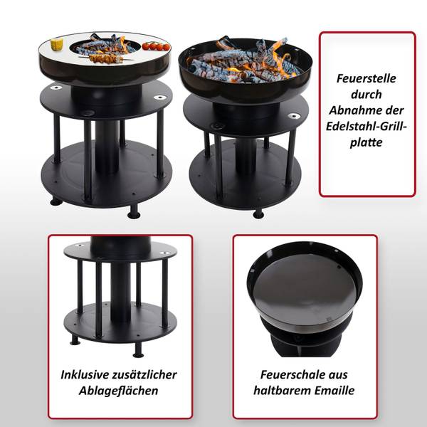 Diese schicke Feuerschale mit Grillplatte überzeugt nicht nur durch ihr Design, sondern auch durch Multifunktionalität. Zuerst können Sie köstliches Grillgut zubereiten und danach noch aufgewärmt und gemütlich den Abend bis in die späten Stunden, ausklingen lassen. Allerlei Grillutensilien können griffbereit in den integrierten Ablageflächen untergebracht werden. Für die Feuerschale wurde als Material Emaille verwendet, es besteht aus Glas und anderen natürlichen Rohstoffen wie Quarz und Metalloxiden. Der Verbundstoff ist haltbarer als eine Beschichtung, leicht zu reinigen und sogar bakterienhemmend. Der praktische 2 in 1 Feuerkorb lässt bei geselligem Zusammensein keine Wünsche offen.