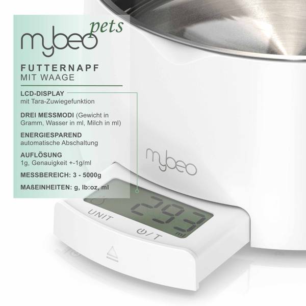 Mit der Waagefunktion können Sie ihrem Liebling exakt soviel zu essen geben, wie es seine Gesundheit vorgibt. Wichtige Medikamente lassen sich grammgenau verabreichen und unter das Futter mischen. Die Tara-Funktion ermöglicht das gestaffelte Abwiegen zahlreicher Zutaten direkt im Napf.