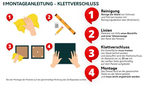 - Montagemethode: mit Klebstoff, Klettverschluss oder Montageschaum (Diese Accessoires sind nicht im Set enthalten. Der Kunde muss diese selbständig erwerben),
