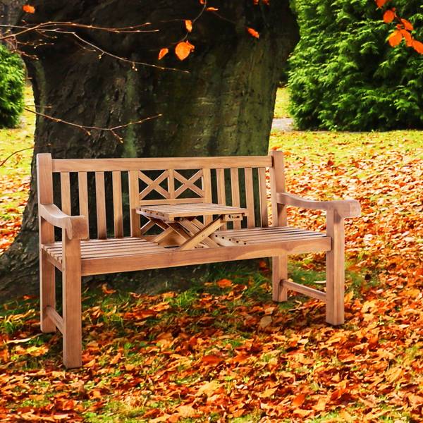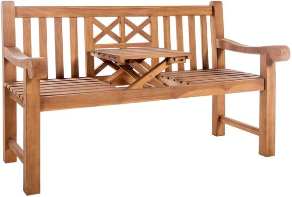 Neben der schicken, klassischen Optik punktet die Teakbank Luka mit dem praktischen integrierten Klapptisch.