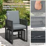 Wenn sie nicht verwendet werden, stecken Sie die 2 Ottomanen einfach unter die Stühle. Dann klappen Sie die Rückenlehnen um und schieben die Stühle und Ottomanen unter den Tisch. Mit diesem cleveren Design können Sie Ihren Außenbereich optimal nutzen.