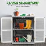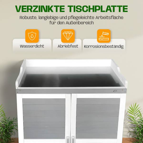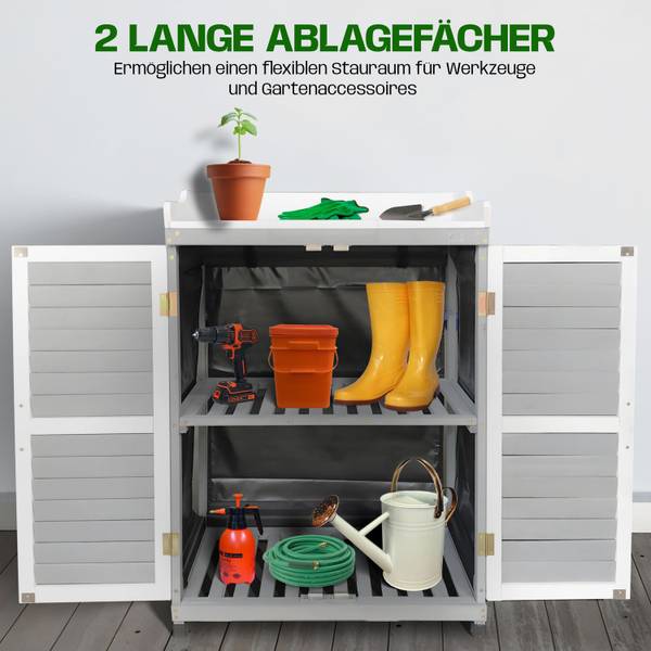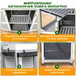 Ein besonderes Highlight sind die aufrollbaren Rück- und Seitenwände, die eine flexible Nutzung ermöglichen. So können Sie den Schrank bei Bedarf öffnen und für eine gute Luftzirkulation sorgen. Die verzinkte Tischplatte ist robust und wetterbeständig – perfekt für Gartenarbeiten wie Umtopfen oder Pflanzenpflege. Die Türen mit Magnetverschluss sind für eine sichere Aufbewahrung, während das stilvolle Design den Gartenschrank zu einem echten Hingucker macht.