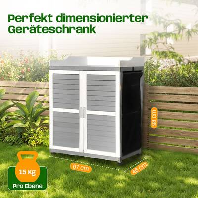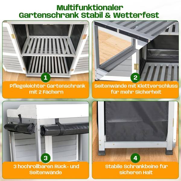Die aufrollbaren Rück- und Seitenwände bieten eine besondere Flexibilität: Sie können den Schrank offen oder geschlossen nutzen, je nach Bedarf und Witterung. Das ist besonders praktisch, wenn Sie ihn als Pflanztisch oder Arbeitsstation verwenden möchten. Die Türen mit Magnetverschluss ermöglichen ein einfaches Öffnen und Schließen und schützen Ihre Gartengeräte vor Schmutz und Feuchtigkeit.
