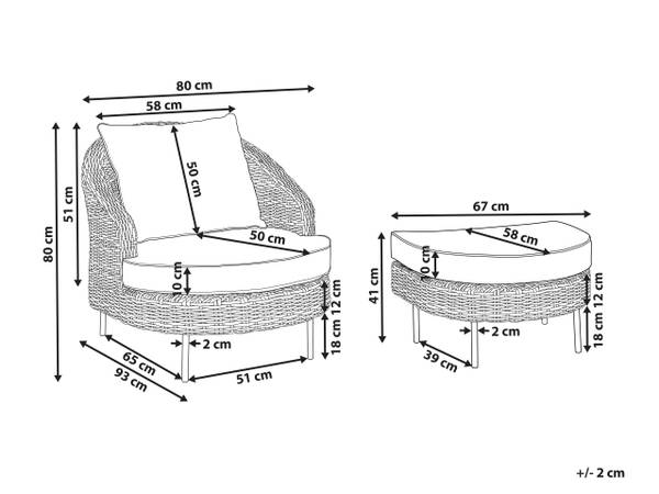 - Lieferumfang: 1 x Stuhl, 1 x Ottomane, 2 x Sitzkissen, 1 x Rückenkissen