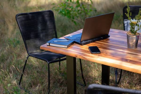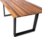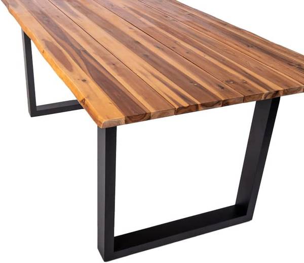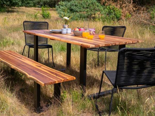 Stabiles U-Gestell – Industrial Chic für draußen:Das schwarz lackierte U-förmige Metallgestell setzt einen modernen Kontrast zum warmen Holz und sorgt für hohe Stabilität. Herausdrehbare Füße mit Bodenschonern gleichen kleine Unebenheiten aus und bieten sicheren Stand auf Stein, Holz oder Rasen.