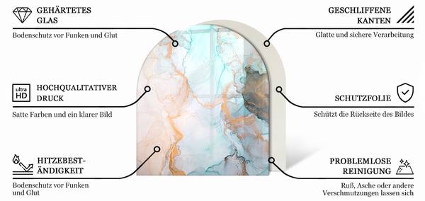 Unsere dekorative Glas-Kaminschutzplatte ist eine innovative Lösung für den Schutz Ihres Bodens. Die 4 mm starke Platte aus gehärtetem Floatglas ist hitzebeständig, kratzfest, wisch- und wasserfest. Unter dem Glas befindet sich ein Druck auf Latexmaterial, der zusätzlich mit einer Folie geschützt ist. Abgerundete Kanten und rutschfeste Silikonfüße im Lieferumfang sorgen für sichere Handhabung und Stabilität.